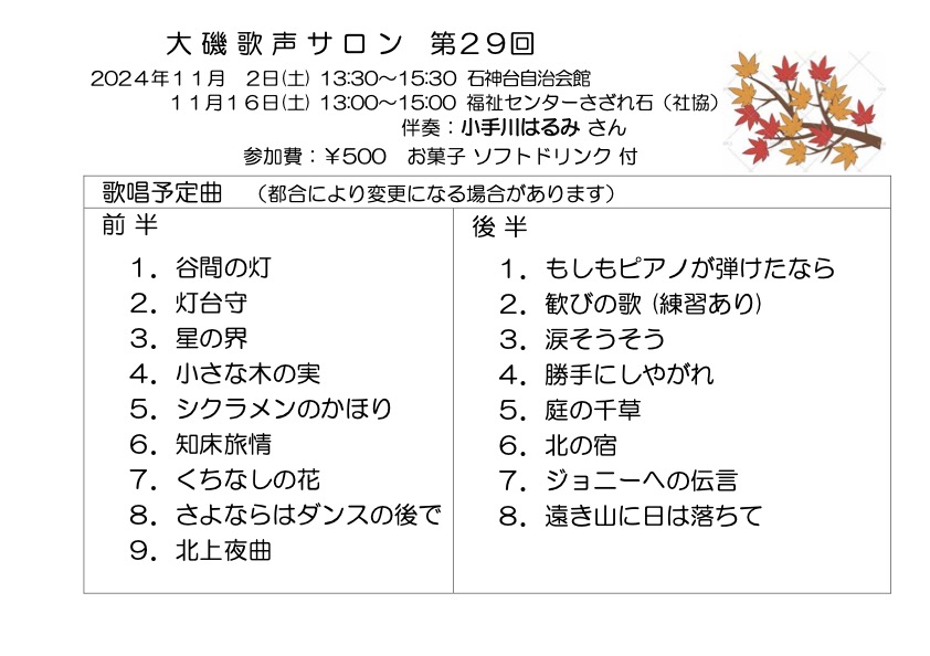 「大磯歌声サロン 2024年11月」の開催のご案内 mirio2024年10月29日2024年10月29日 イベント, 石神台ブログ 申し込み不要です。皆様のお越しをお待ちしています。過去の曲名はこちらからも見れます → 「大磯歌声サロン」のご案内 ← 本日「石神台ハロウィン2024」を 開催します 議会報告会のお知らせ →