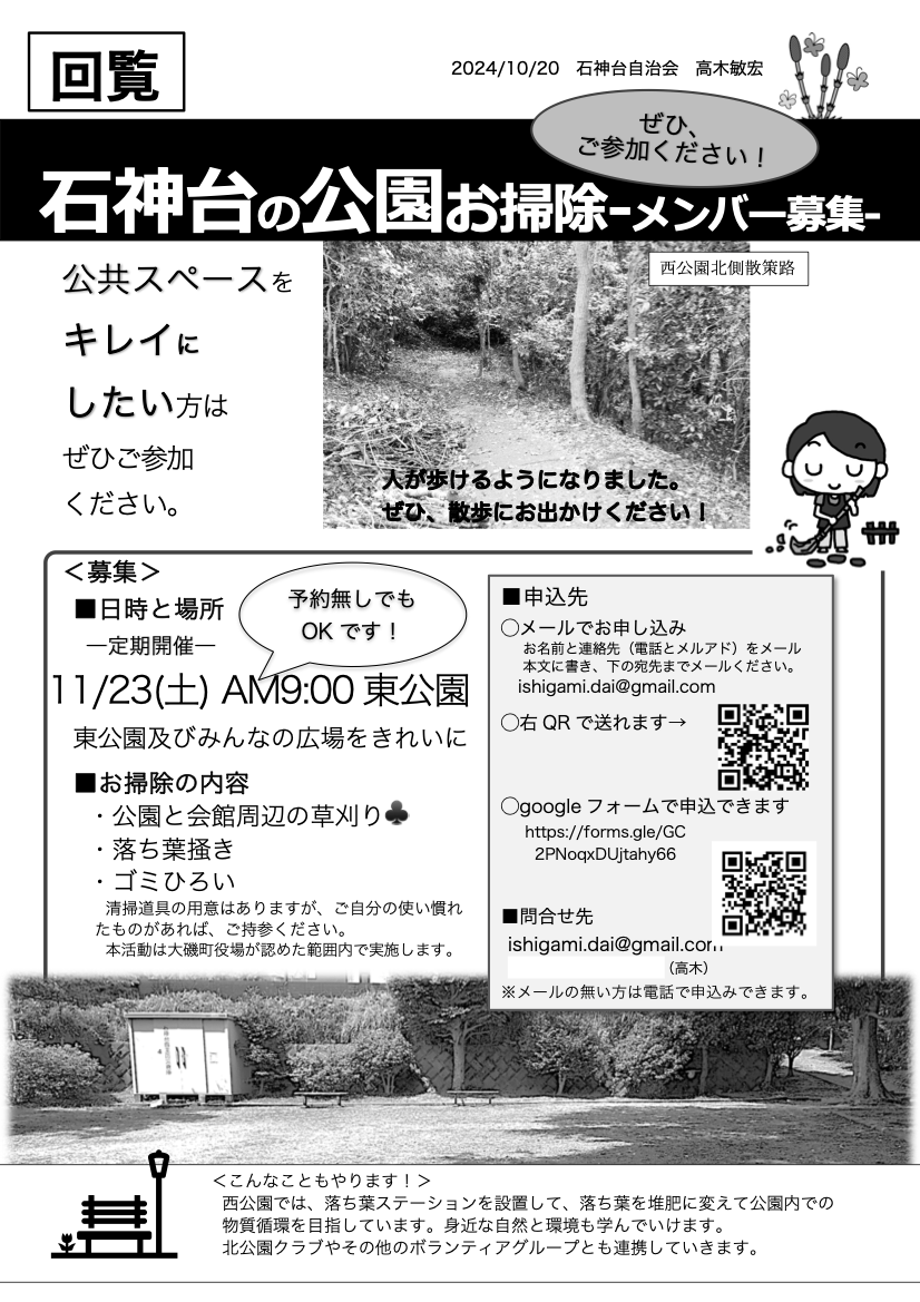 石神台の公園お掃除メンバー募集 mirio2024年11月1日2024年11月1日 自治会からのお知らせ 日時と場所:11月23日(土)AM9:00 東公園 ← 大磯町総合防災訓練ご協力のお願い 石神台マルシェ vol.8 開催のお知らせ →