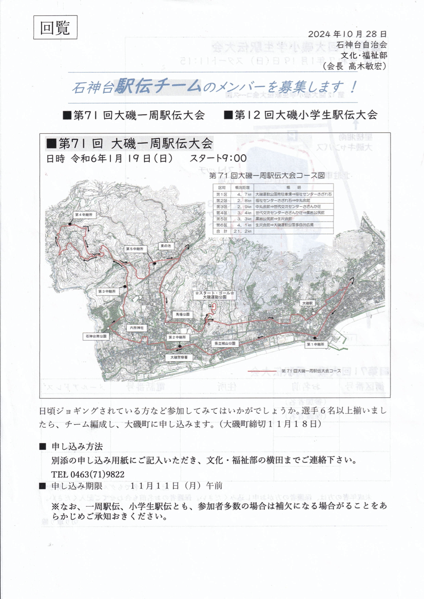石神台駅伝チーム メンバー募集のお知らせ mirio2024年11月1日2024年11月1日 自治会からのお知らせ 申込期限:11月11日(月)午前 ← 不動川河川工事の進捗状況のお知らせ 大磯町総合防災訓練ご協力のお願い →