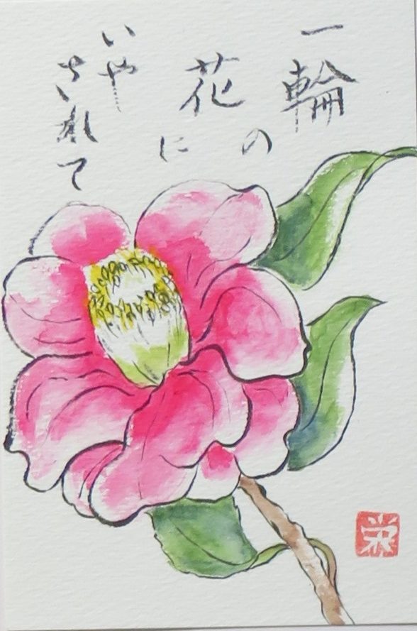 この絵は、とても優美で温かみのあるタッチで描かれた花の水彩画ですね。ピンク色の花びらの柔らかなグラデーションが美しく、葉の緑と茎の茶色との色合いの調和が素晴らしいです。また、手書きの文字が添えられており、作品に深みを加えています。「一輪の花にいやされて」という言葉が、花の美しさと癒しの力を伝えていて、心を穏やかにしてくれます。
