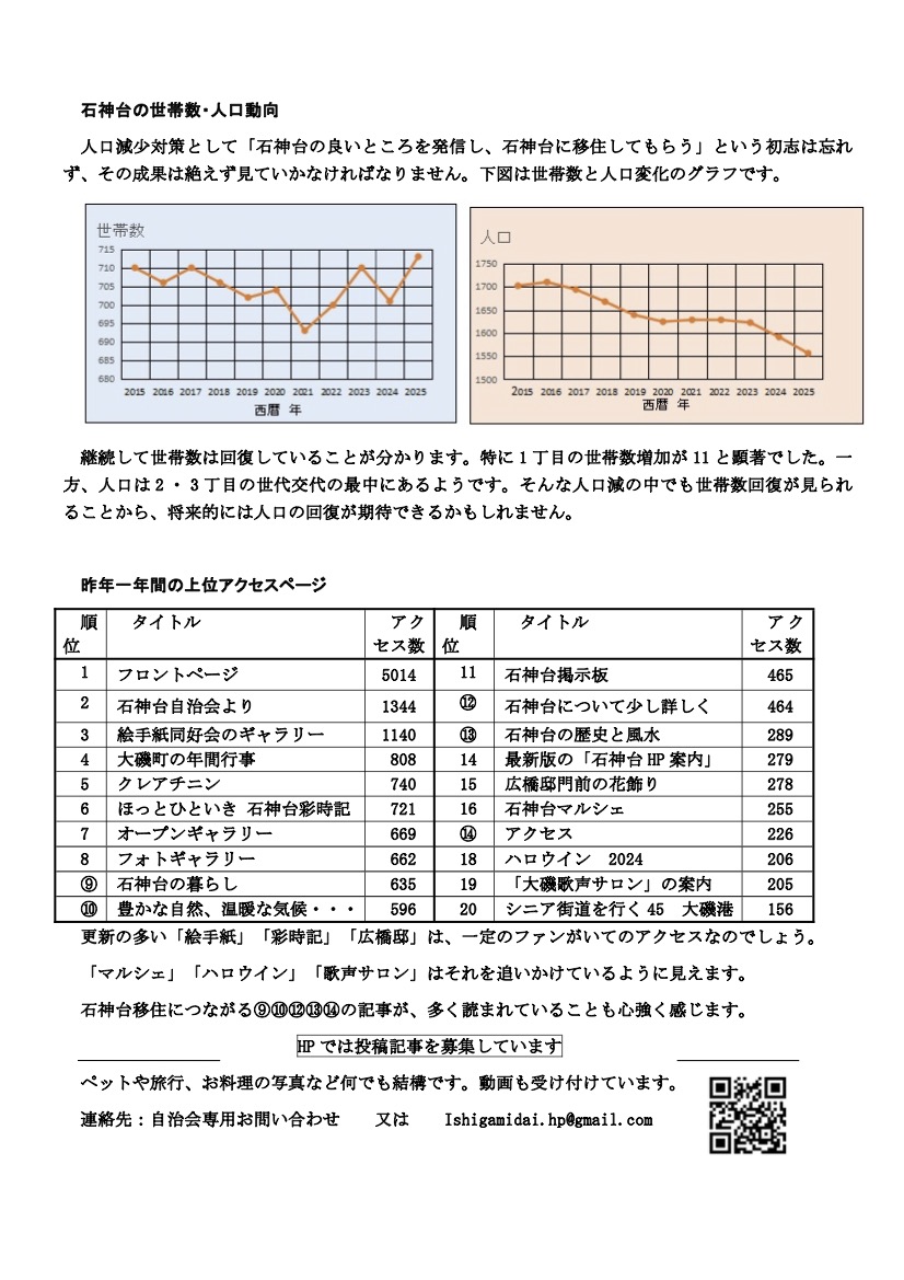 ホームページでは投稿記事を募集しています。ペットや旅行の写真、趣味の写真など何でも結構です。動画も受け付けつけています。投稿したい方、詳しく知りたい方は、自治会専用お問い合わせ↓にてお気軽にご連絡ください。