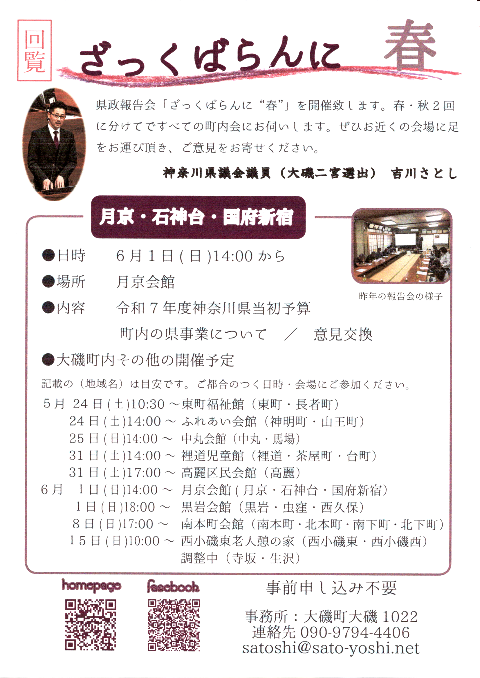 県政報告会「ざっくばらんに春」のご案内 mirio2025年5月12日2025年5月12日 自治会からのお知らせ 日時:6月1日(日)14時場所:月京会館 ← 令和7年度 石神台美化活動についてのお知らせ 2025年5月の絵手紙をアップしました →