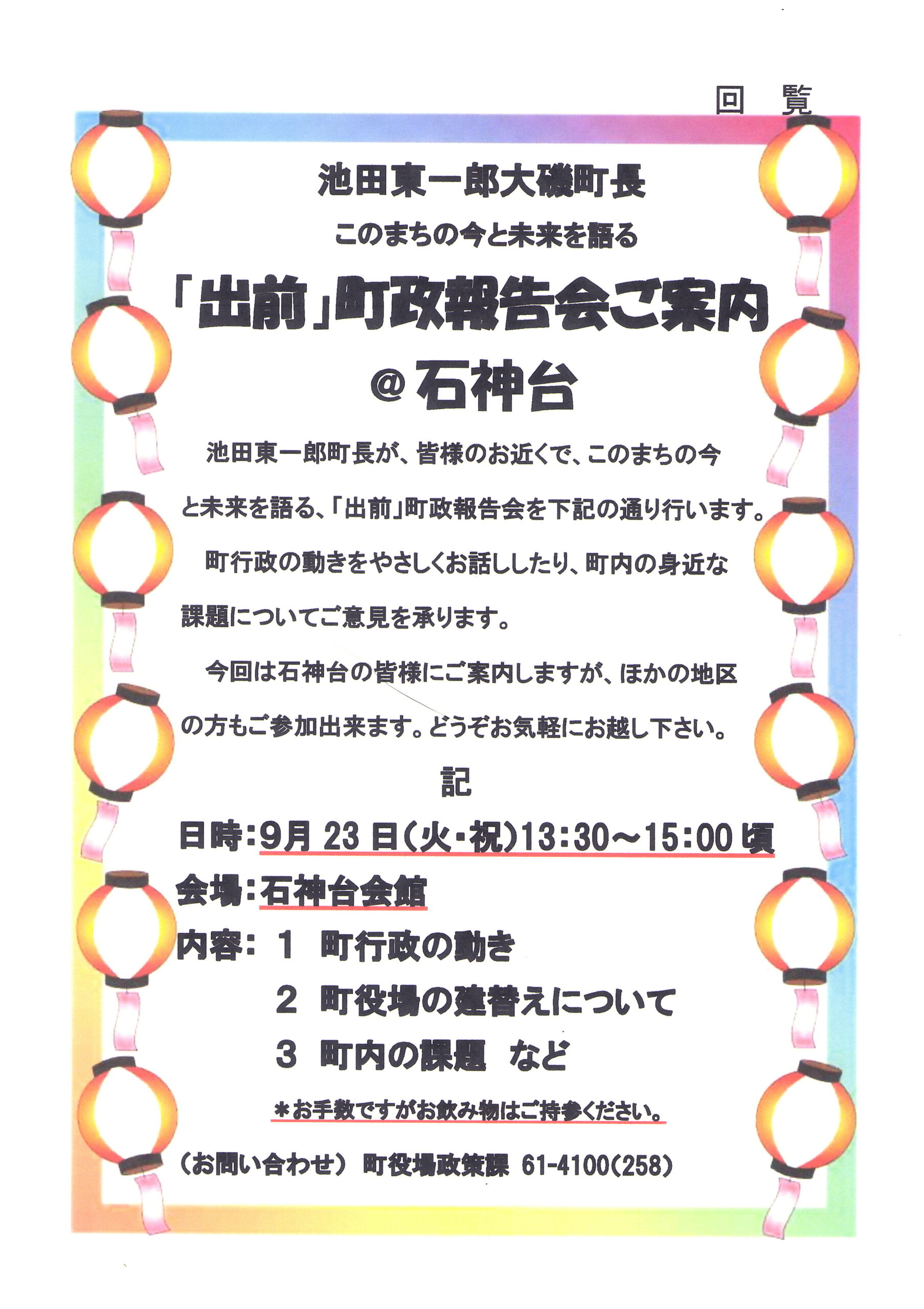 「出前」町政報告会ご案内@石神台 横山2025年8月29日2025年9月3日 自治会からのお知らせ 日時:9月23日(火・祝)13:30~15:00頃会場:石神台会館 ← 歴史研究発表会の御案内 大磯駅前 令和7年9月号 →