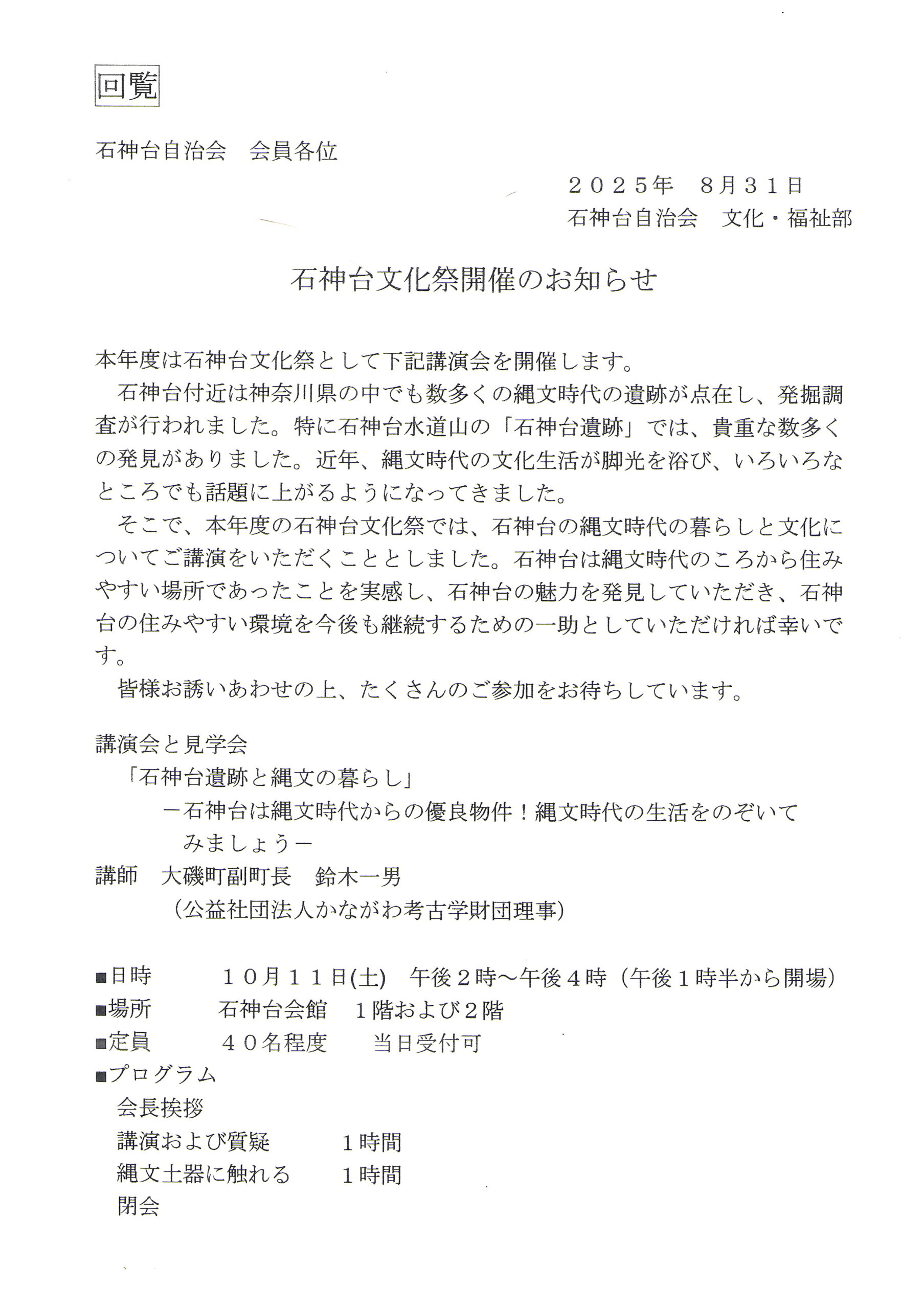 石神台文化祭開催のお知らせ 横山2025年9月14日2025年9月14日 自治会からのお知らせ 日時:10月11日(土)午後2時~午後4時(午後1時半から開場)場所:石神台会館 1階および2階 ← 大磯駅前 令和7年9月号 【訂正とお詫び】美化活動の10月の予定日について →