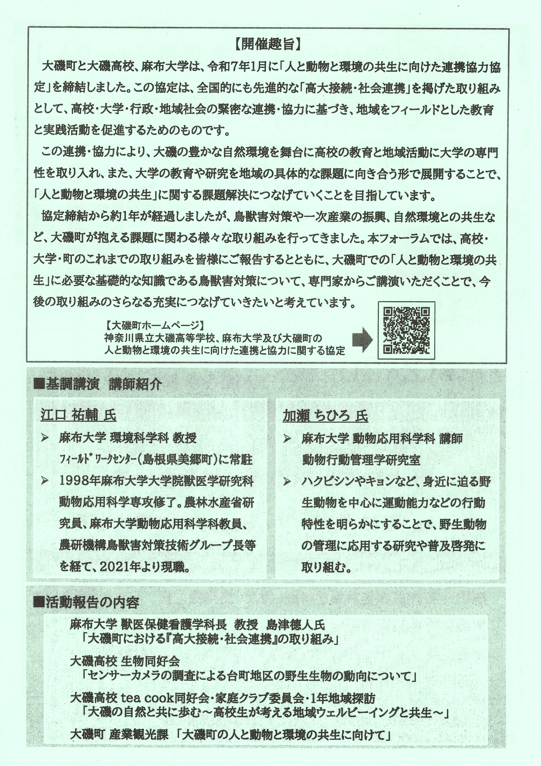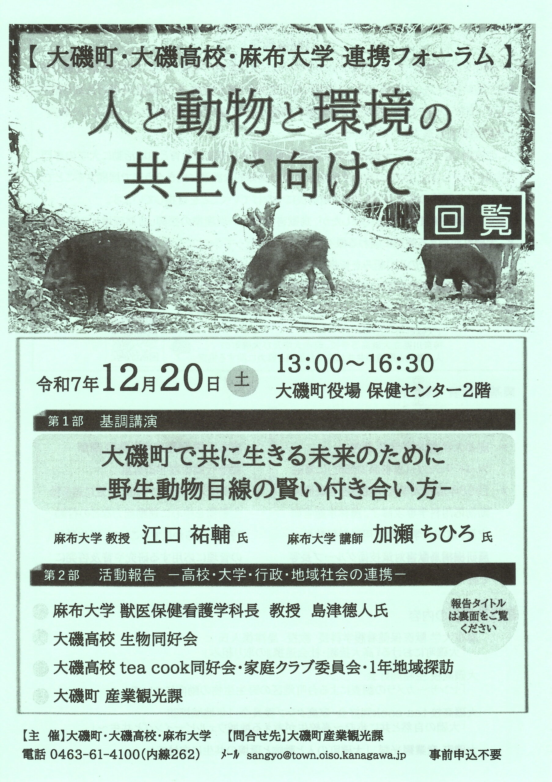 大磯町・大磯高校・麻布大学連携フォーラム 横山2025年11月30日2025年11月30日 自治会からのお知らせ 「人と動物と環境の共生に向けて」日時:令和7年12月20日(土)13:00~16:30場所:大磯町役場 保健センター2階 ← 湘南国際マラソン交通規制のお知らせ 県民のまもり 第321号 →