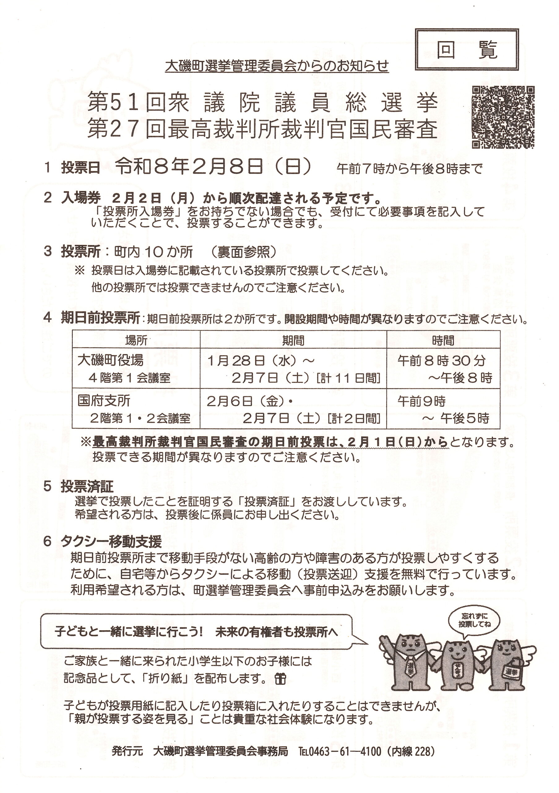 大磯町選挙管理委員会からのお知らせ 横山2026年1月30日2026年1月30日 自治会からのお知らせ No Comments 投票日:2月8日(日)午前7時~午後8時まで ← 2025年度第2回(12月)街区役員会議事録 大磯駅前 令和8年2月号 → コメントを残すコメントをキャンセル