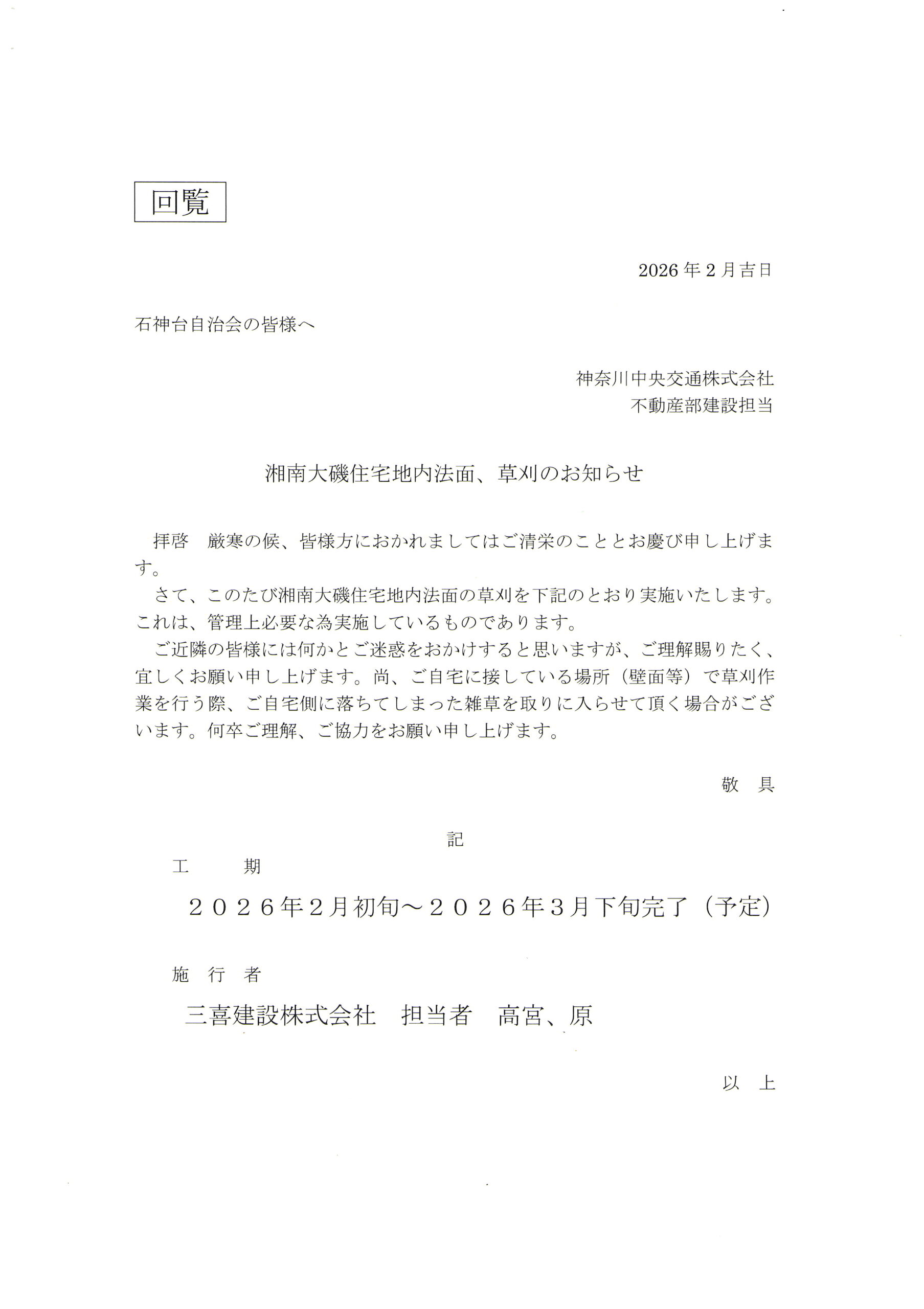 湘南大磯住宅地内法面草刈のお知らせ